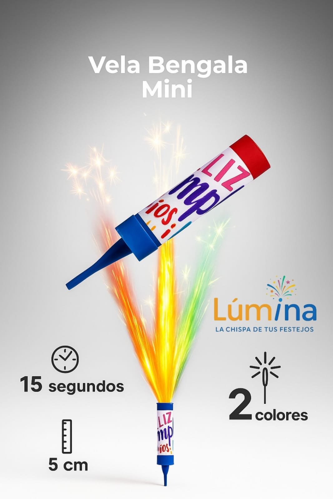 Bengala mini para decoración de celebraciones. Duración aproximada: 15 segundos. Tamaño: 5 cm. Efecto: 2 colores. Recomendado para uso en pasteles, cupcakes y postres en eventos. Venta exclusiva por mayoreo (mínimo 1,000 piezas). Cotización requerida; costo de envío se calcula por separado.