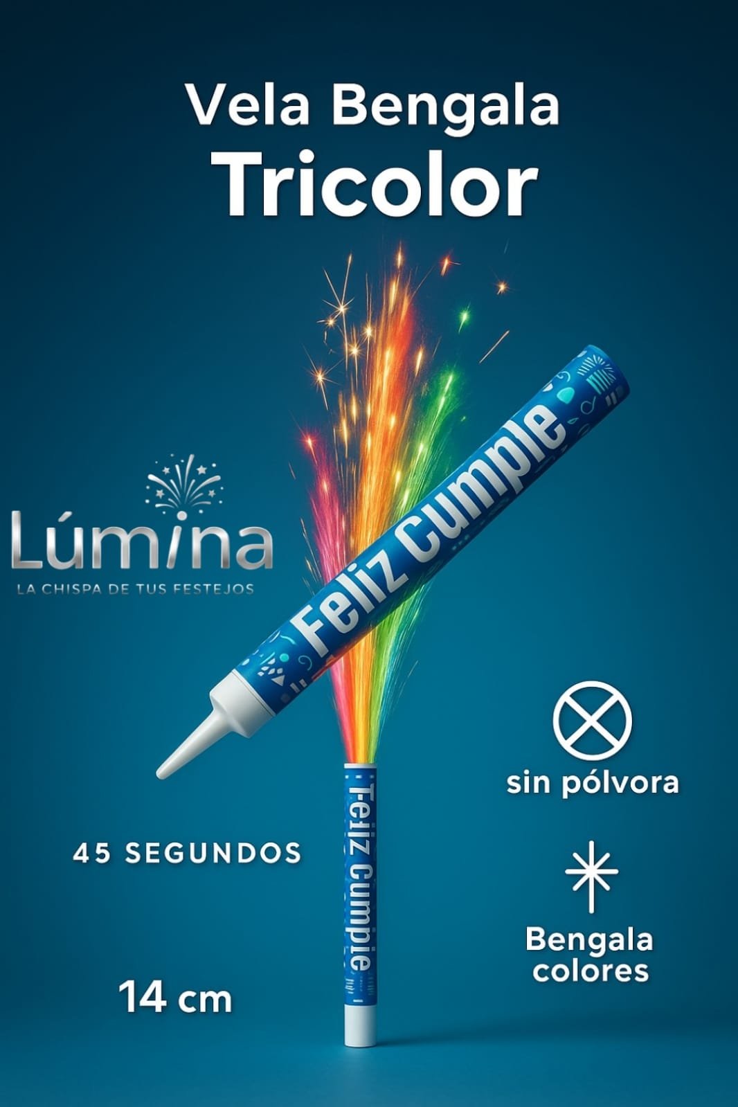 Bengala tricolor de mayor tamaño para celebraciones con alto impacto visual. Duración aproximada: 45 segundos. Tamaño: 14 cm. Recomendada para pasteles grandes, eventos y fotografía. Venta exclusiva por mayoreo (mínimo 1,000 piezas). Cotización requerida; costo de envío se calcula por separado.